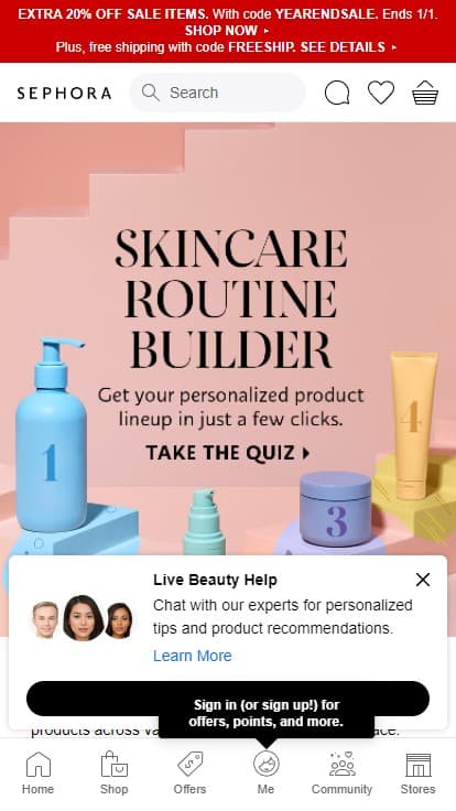 SephoraSkincare routine quizHealthcareProduct recommendationA flow for determining skincare needs of the user and provides product suggestions for shopping.See live